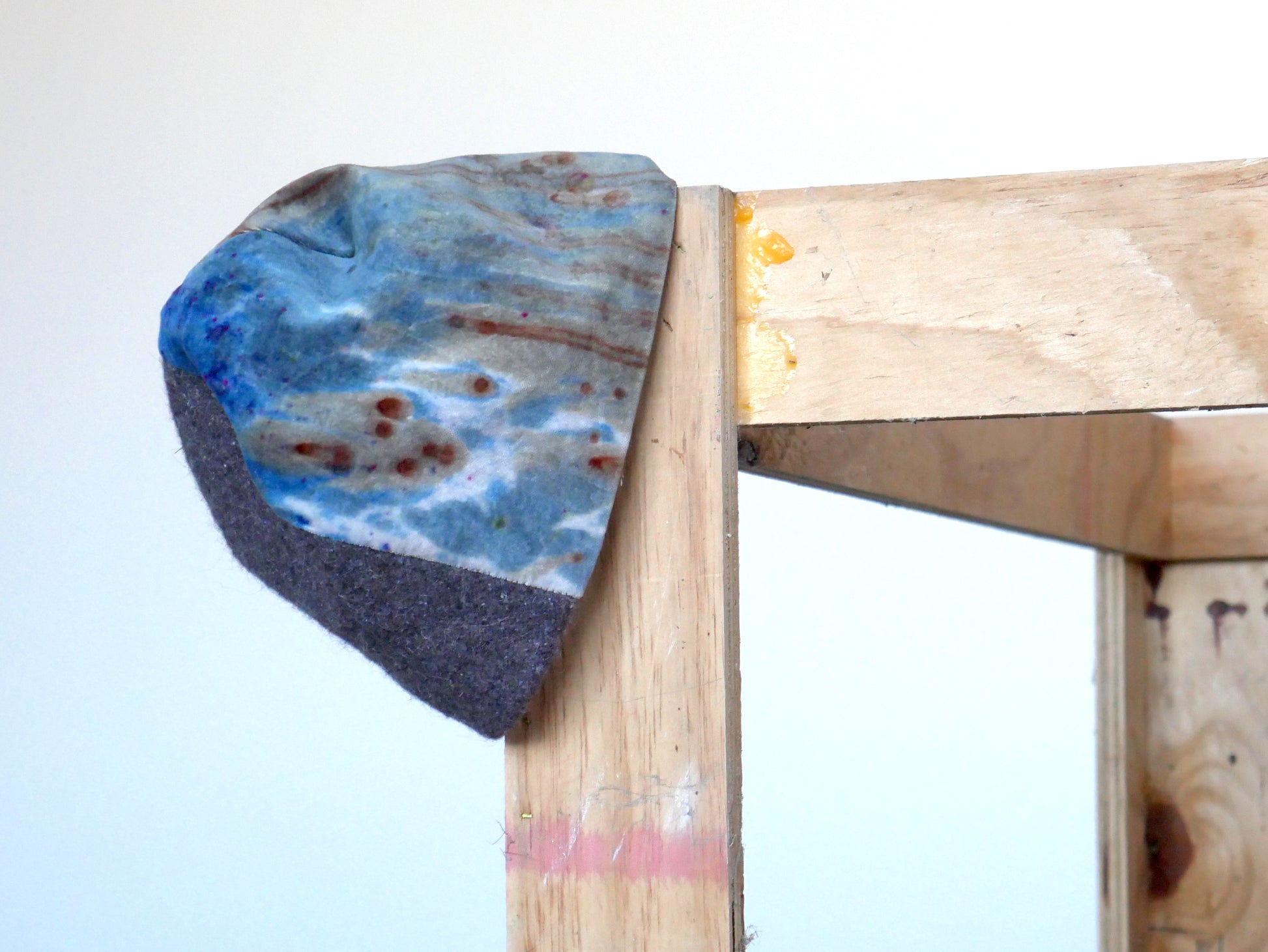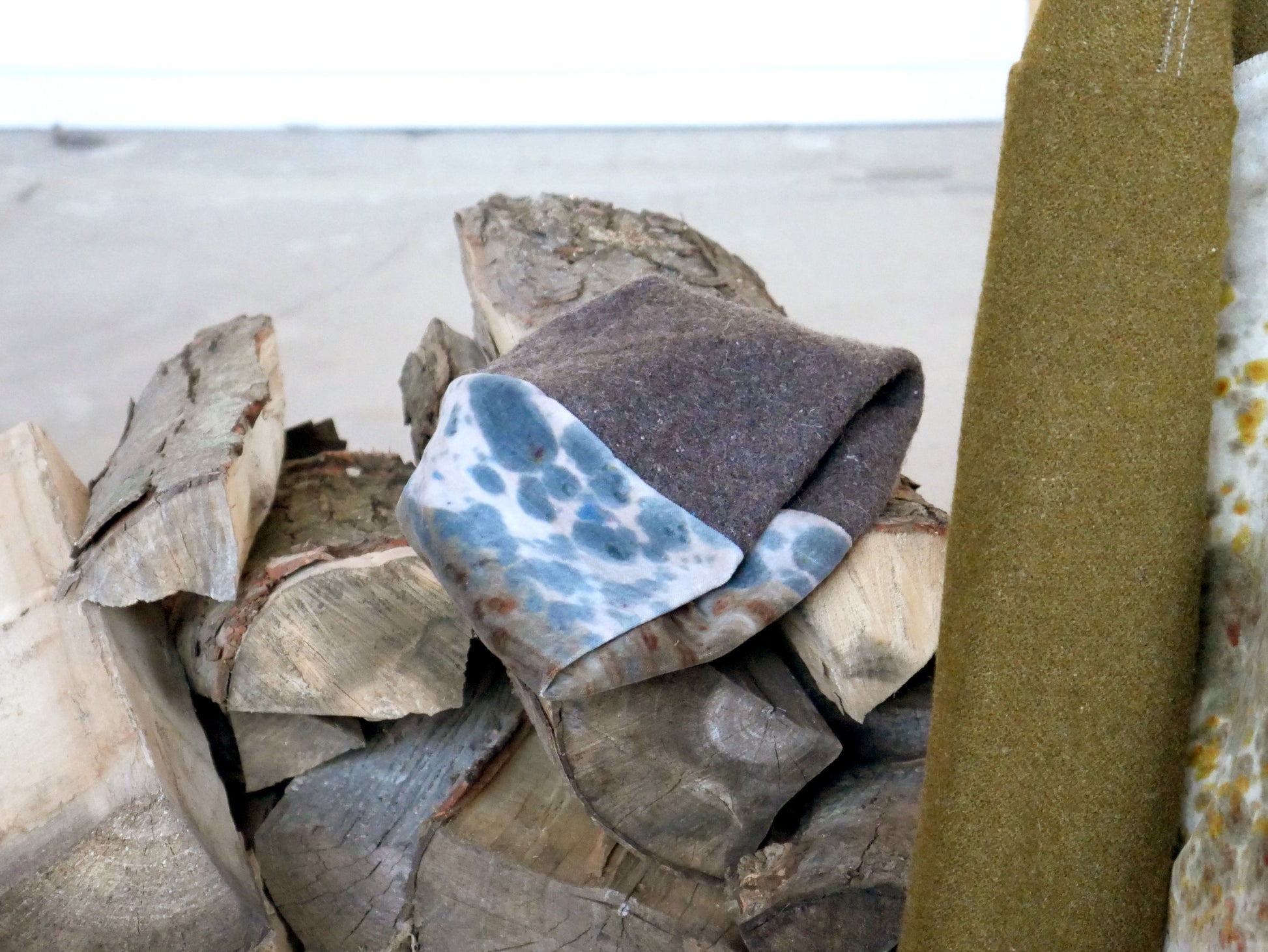 - vintage woolen utility blanket and Cotton velvet naturally dyed with hibiscus and iron and mono-printed with fiber reactive dye