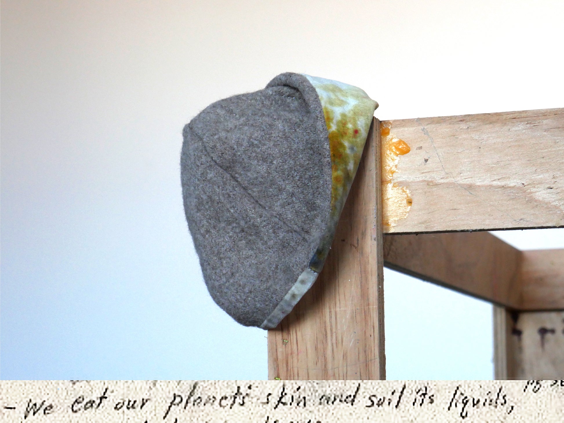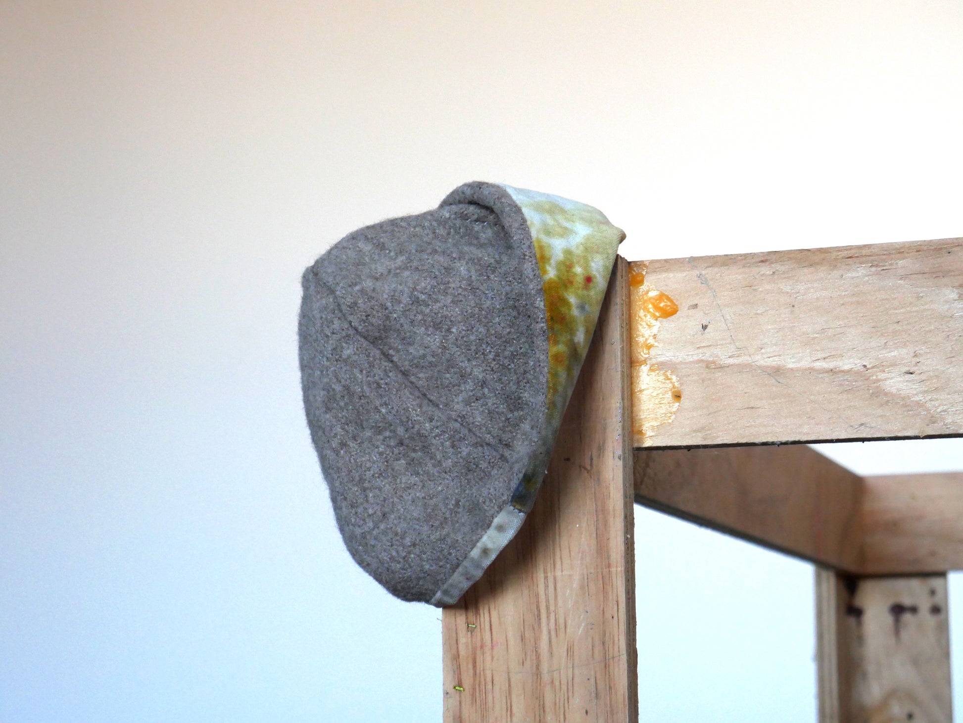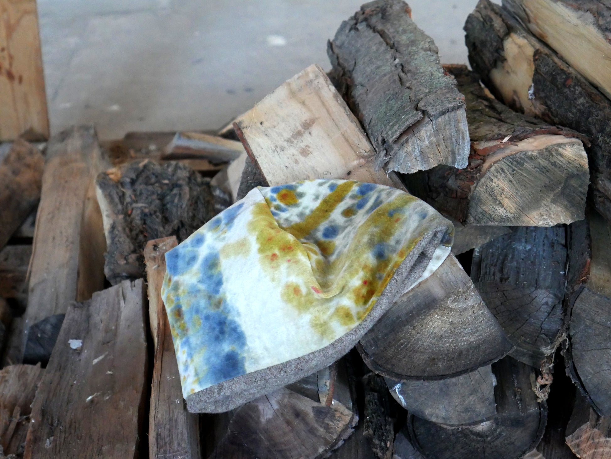 - vintage woolen utility blanket and Cotton velvet naturally dyed with hibiscus and iron and mono-printed with fiber reactive dye