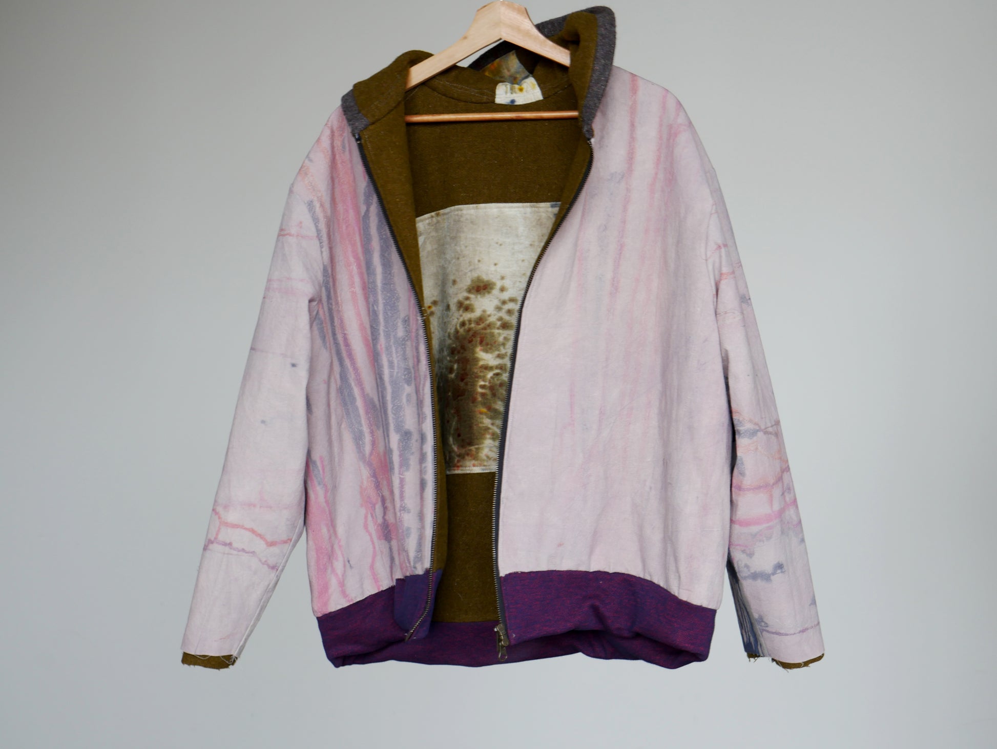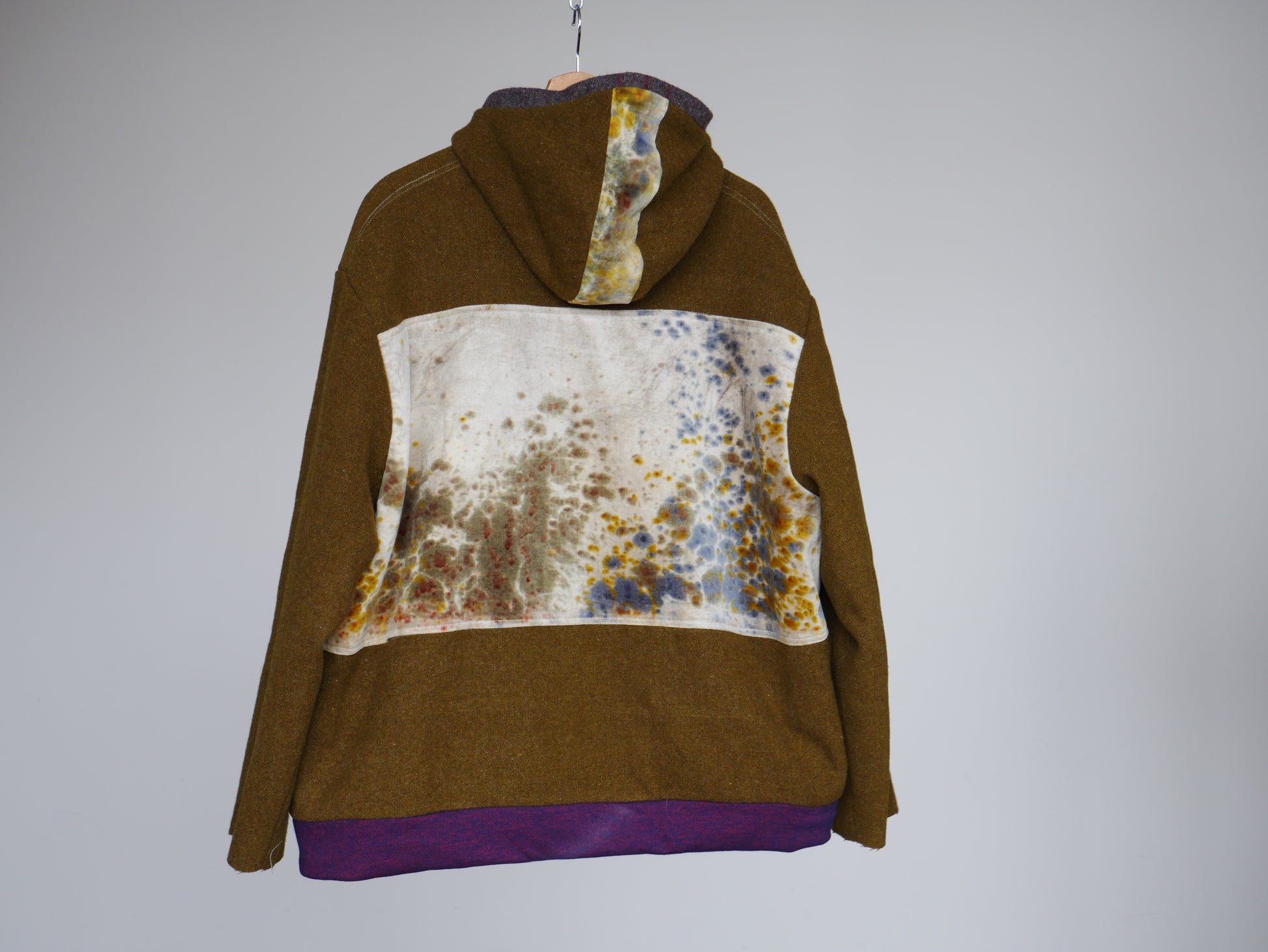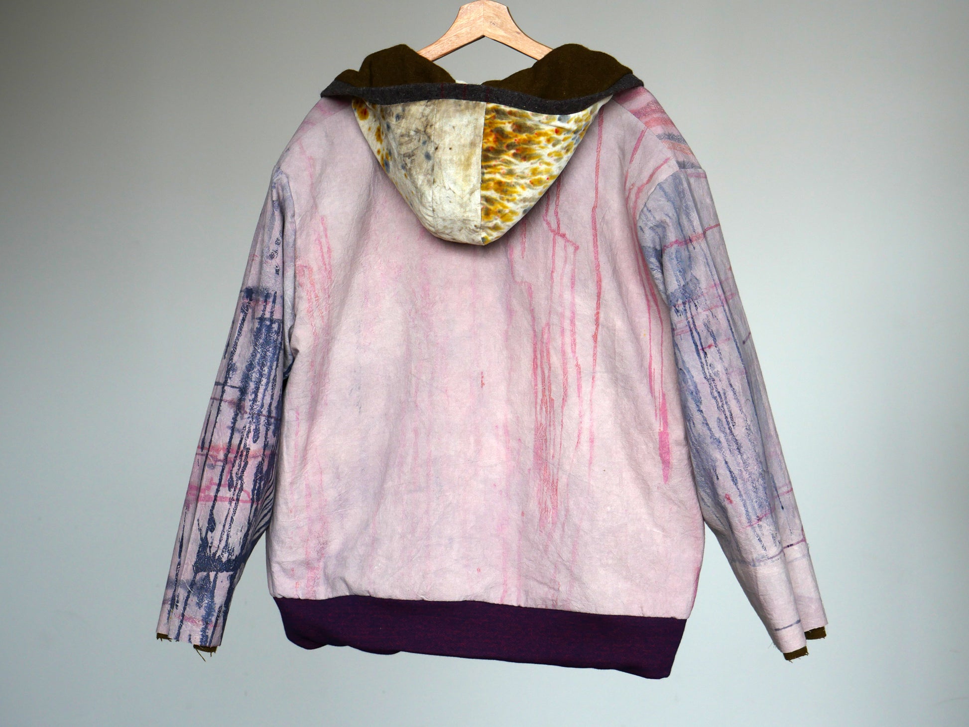 - Cotton velvet panel on hood and back, mono-printed with fiber reactive dye, naturally dyed with eucalyptus and iron