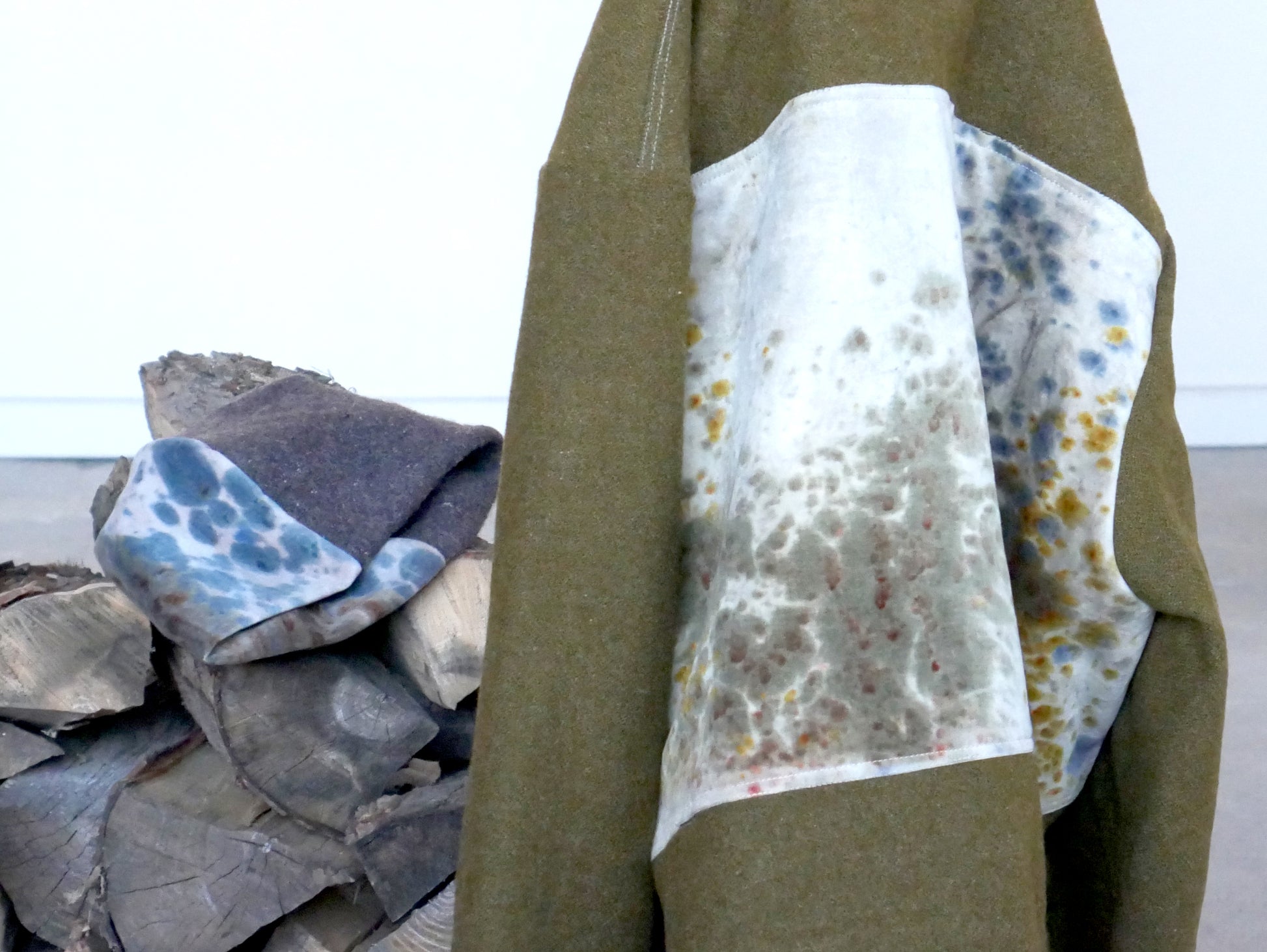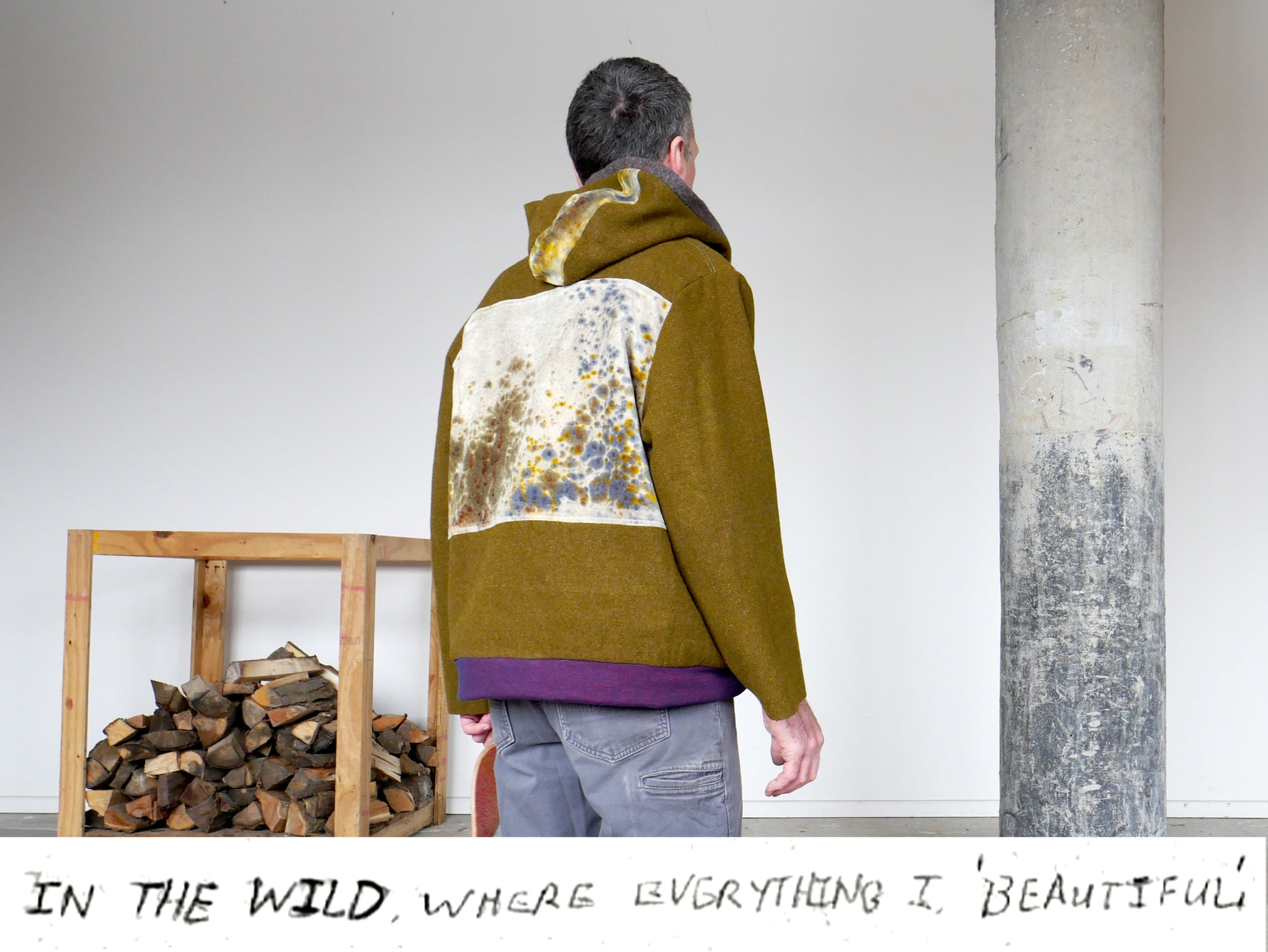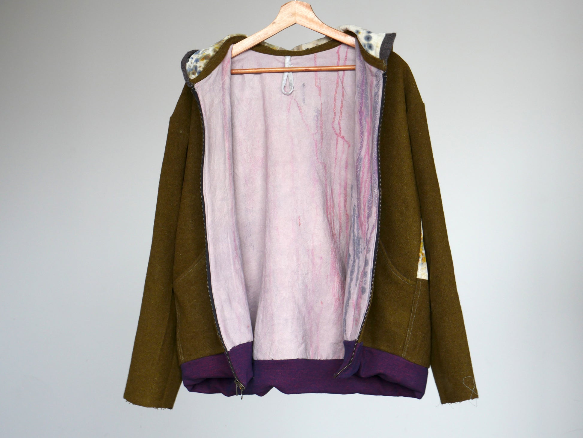- Cotton velvet panel on hood and back, mono-printed with fiber reactive dye, naturally dyed with eucalyptus and iron